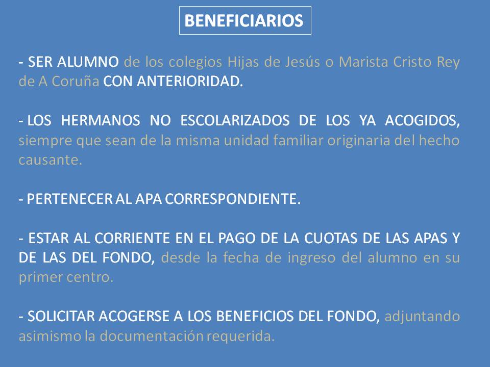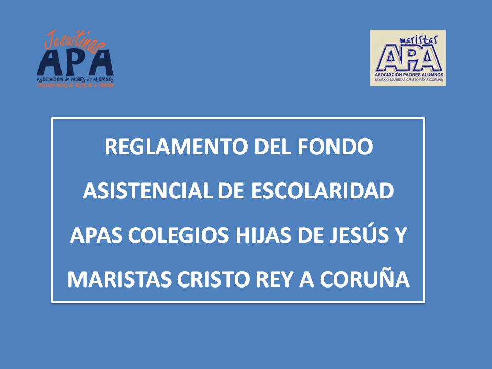 Os informamos de que el día 22 de este mes se aprobó en Asamblea General Extraordinaria el nuevo Reglamento del Fondo Asistencial de Escolaridad de las APAs de los Colegios Hijas de Jesús y Maristas Cristo Rey de A Coruña, con efectos de aplicación a partir del día 23 de Junio de 2017.