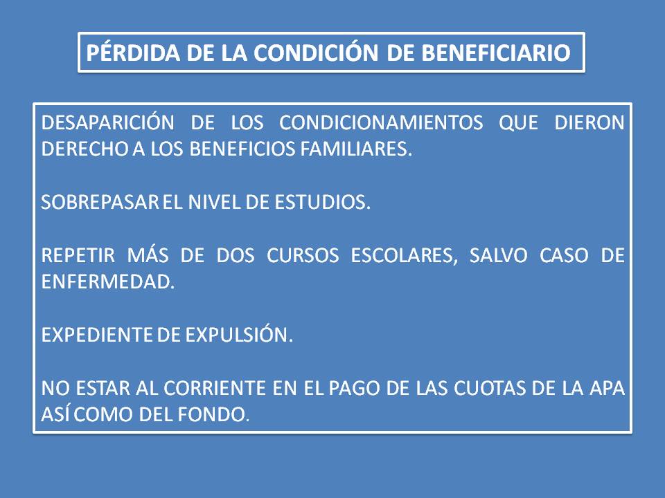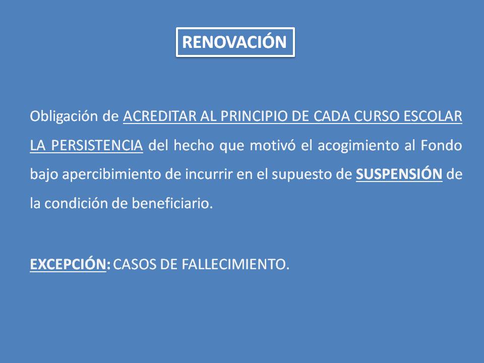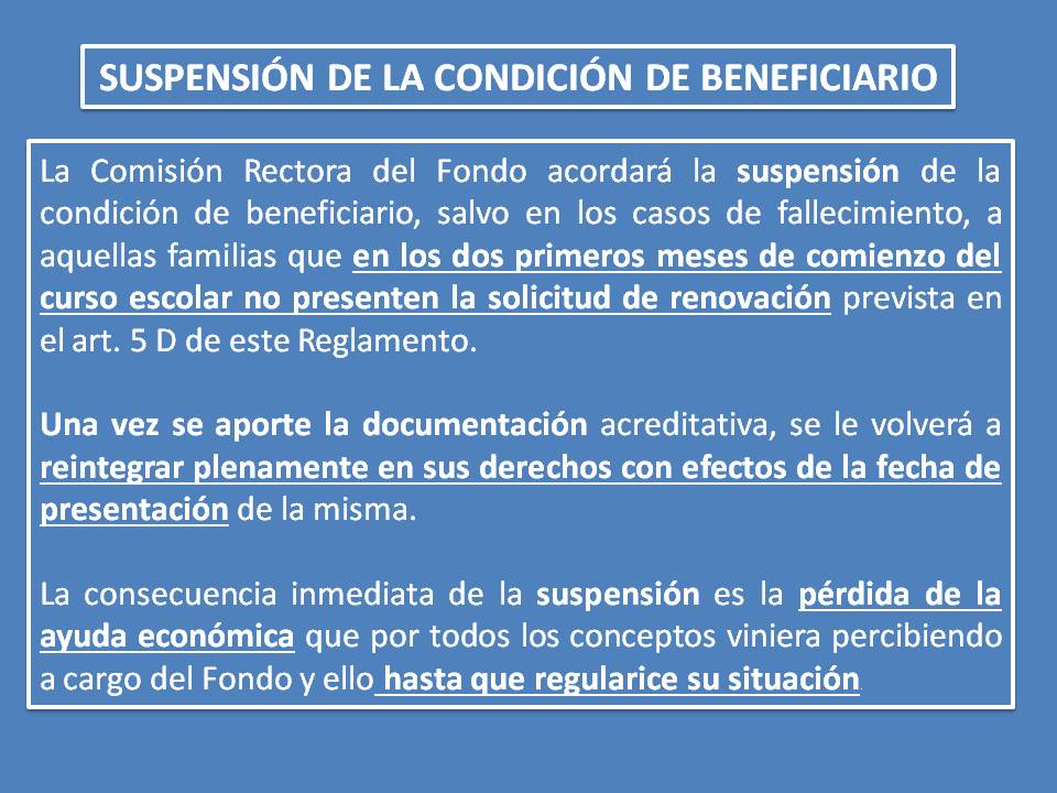 Con este nuevo Reglamento hemos intentado dar respuesta a peticiones formuladas por muchas familias; en este sentido se ha dado cabida a la inclusión de nuevos partícipes que con anterioridad no se habían adherido al Fondo de Escolaridad, brindar unas mayores coberturas sin comprometer el fondo de reserva (pasando de cubrir la escolaridad, el transporte y la donación, a estos dos primeros y el comedor); en definitiva, se ha intentado que los alumnos acogidos puedan continuar y terminar sus estudios teniendo los gastos de su escolarización cubiertos.