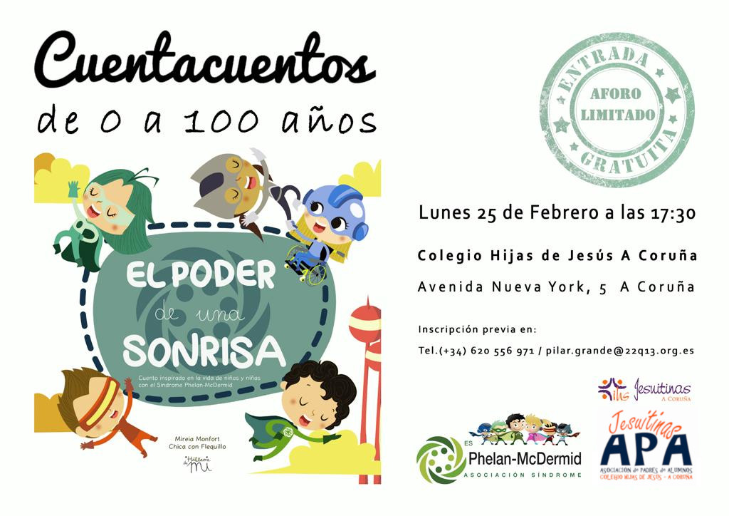 Con ese afán, este lunes día 25 de febrero de 2019, a las 5:30 de la tarde, tendremos un Cuentacuentos titulado «El Poder de una Sonrisa». Nos lo trae Pilar Grande Seijas, delegada de Galicia de la Asociación del Síndrome de Phelan-McDermid.